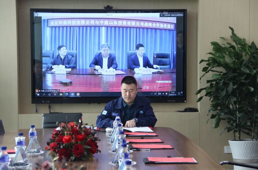 3月15日上午,煙臺金正環(huán)??萍加邢薰荆ㄒ韵潞喎Q金正環(huán)保)與中建山東投資有限公司(以下簡稱中建山東)在金正環(huán)保產(chǎn)業(yè)園簽訂戰(zhàn)略合作框架協(xié)議。為落實疫情防控工作要求,此次簽約采取“線上+線下”的方式進行,金正環(huán)保為主會場,中建山東董事長裴正強、總經(jīng)理王有標等領(lǐng)導線上連線進行,中建山東副總經(jīng)理嚴強、金正環(huán)保總經(jīng)理李越彪等領(lǐng)導現(xiàn)場出席簽約儀式。
