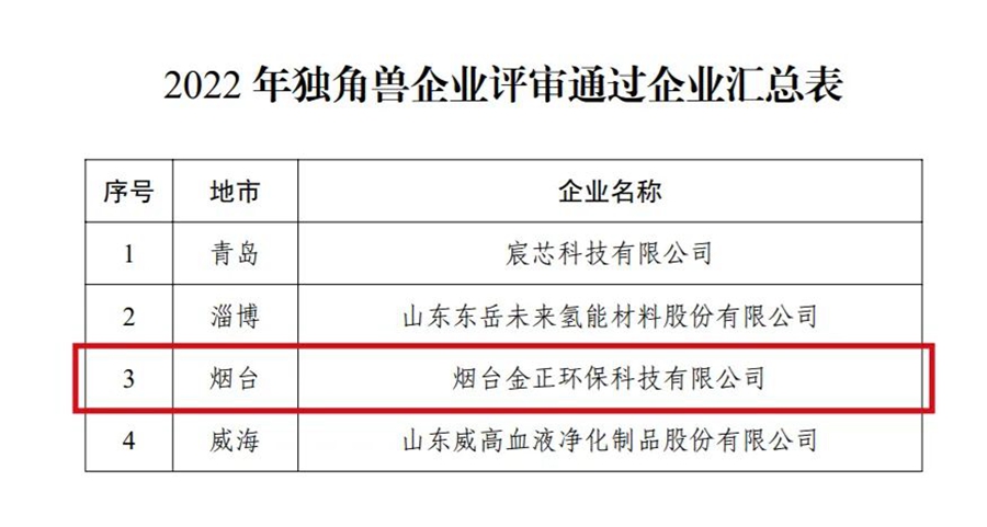 7月19日,山東省工信廳正式公布2022年獨角獸企業(yè)榜單,煙臺金正環(huán)保強勢上榜,成為本年度僅有的4家獨角獸企業(yè)之一。