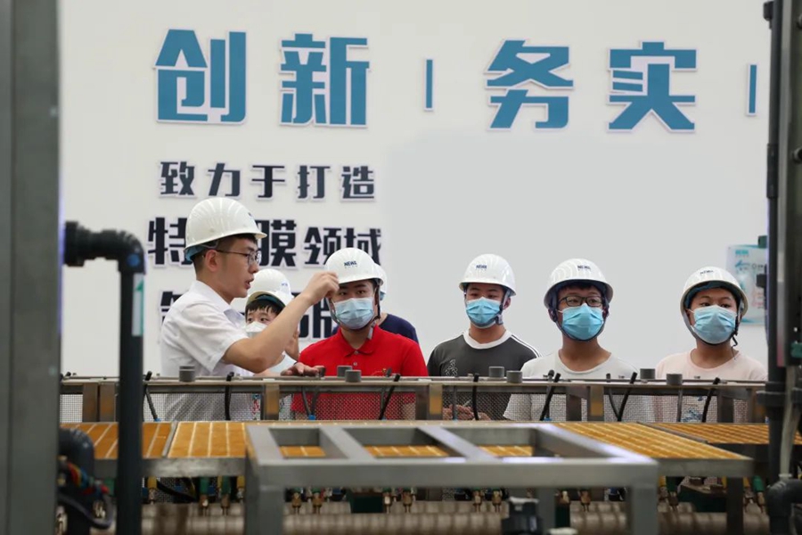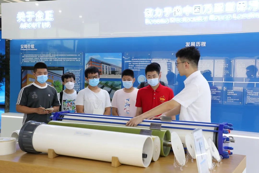 青少年志愿者們依次走訪了公司大數(shù)據(jù)中心、展廳、膜中心、組裝車間、研發(fā)實驗室等地。在這里,志愿者們近距離了解,世界領(lǐng)先的污廢水資源化和高品質(zhì)再生水回用工藝技術(shù),實現(xiàn)年減排污廢水7300萬噸;聆聽“中國人用自己的工藝包”解決“卡脖子”的發(fā)展難題”,打破國外技術(shù)壟斷的項目故事;感知世界領(lǐng)先的“特種膜全自動化生產(chǎn)線”,如何集聚工業(yè)互聯(lián)網(wǎng)、工業(yè)機器人、5G等先進技術(shù),開啟世界膜工業(yè)智能制造時代。