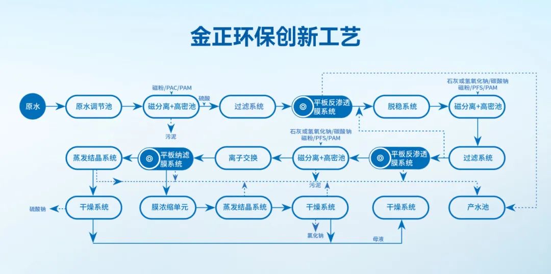 金正環(huán)保煤礦礦井水零排放及資源化利用解決方案,以更短、更高效的流程實現(xiàn)礦井水深度處理及資源化利用,為煤礦及煤化工企業(yè)提供運行成本低、固廢產(chǎn)出量少、膜系統(tǒng)運行穩(wěn)定的創(chuàng)新工藝。該工藝分為四個工藝段,依次是預濃縮工藝段、脫穩(wěn)濃縮工藝段、深度濃縮工藝段、蒸發(fā)結(jié)晶工藝段。各工藝段可根據(jù)來水水量、水質(zhì)進行不同的裝備和工藝組合,實現(xiàn)模塊化、標準化運行,有效解決傳統(tǒng)卷式膜元件易污堵問題,實現(xiàn)高倍濃縮和分鹽,減少蒸發(fā)量,大大降低蒸發(fā)投資及運行成本,保證系統(tǒng)整體穩(wěn)定運行。相比傳統(tǒng)工藝,藥劑用量減少≥80%,軟化污泥產(chǎn)量減少≥60%,去除鈣離子≥70%,成本降低≥60%。